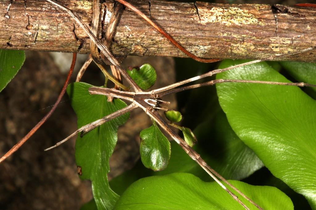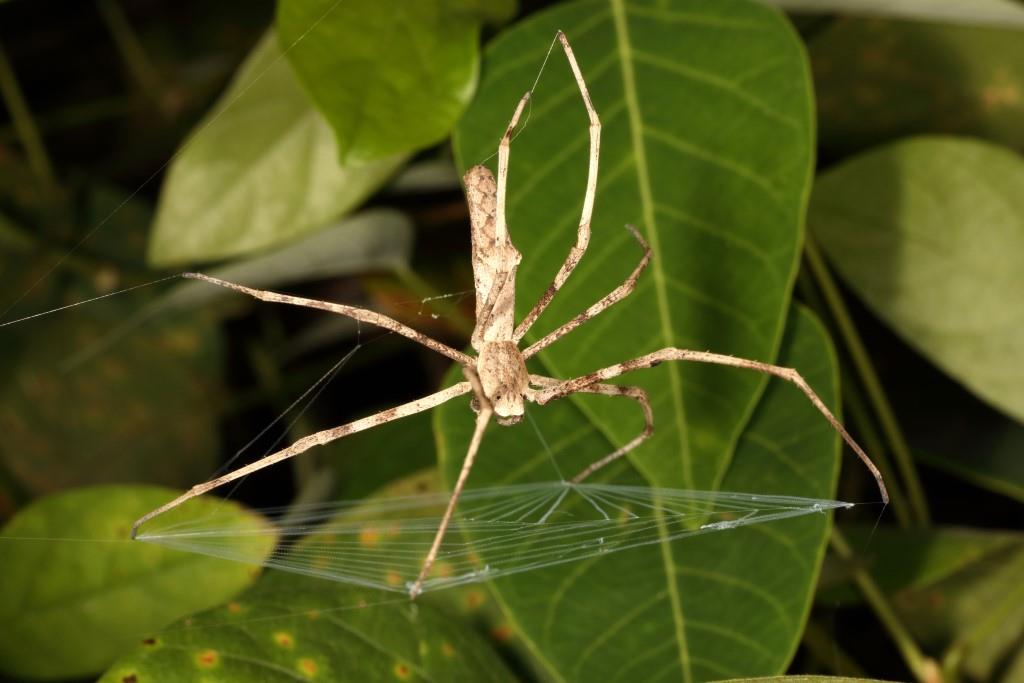When disturbed during the day, Net Casting Spiders move rapidly through foliage by swinging gracefully from one leaf to the next, finally settling down in the characteristic position when the disturbance has passed.