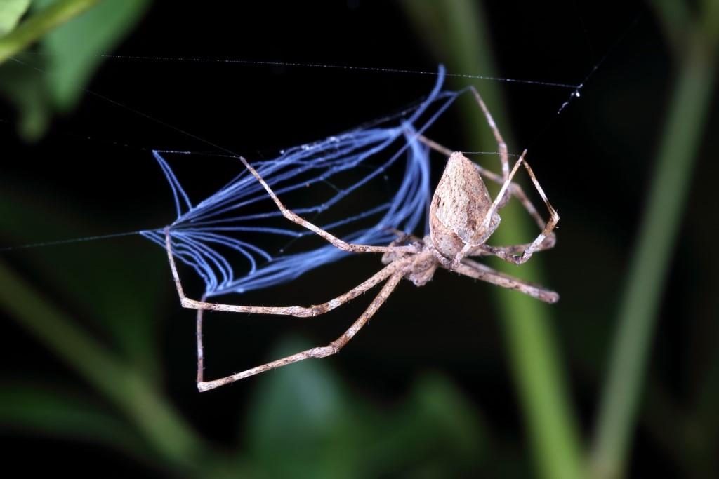 They trap their prey with one of the most remarkable techniques in the animal kingdom. Around dusk, the spider constructs a small rectangular net, about 25-30mm long and 20mm wide. The framework of the net is made of dry silk and onto this is laid a series of sticky and elastic cross-threads (called cribellate silk), which make up the mesh and give the net a fluffy appearance. The cribellate silk is drawn out of the spider’s silk glands at the end of the abdomen by specially designed combs on the back legs that draw out the silk.