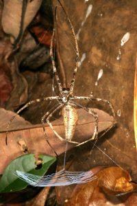 Net Casting Spiders are active at night and spend the day resting suspended by silk in foliage, usually close to the ground. The back legs are held close to the body and the front legs are held out in front of the body in pairs, making the spider surprisingly well camouflaged. Sometimes all legs are held out from the body in pairs, in the shape of a cross.